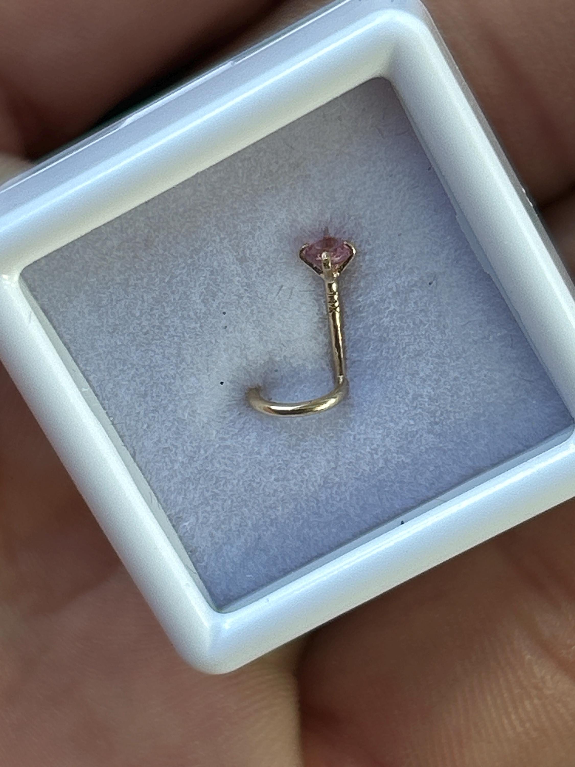 💎Genuine Real Pink Tourmaline Nose Stud, 14K Solid Gold in Twisted Crooked Screw, L-Shaped , Ball End Bar 22GA 20 GA 18GA